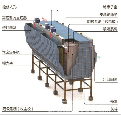 電除塵器的原理及過程:含塵氣體在通過高壓電場進行電離過程中,使塵粒帶電,并在電場力的作用下,使塵粒沉積在集塵極上,將塵粒從含塵氣體中分離。整個除塵過程可劃分為四個階段:荷電、定向移動、粘附和沖洗。